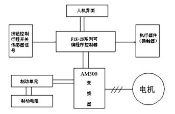 系統(tǒng)組成由人機(jī)界面,PLC,安邦信AMB300系列變頻器,制動單元,制動電阻。在整個系統(tǒng)中PLC和變頻器,觸摸屏均通過 RS-485 進(jìn)行串行通訊。