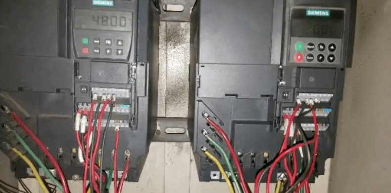 變頻器接線,將兩個變頻器分別定義為主機(jī)和從機(jī),主機(jī)485A端口接入從機(jī)485A端口中,主機(jī)485B端口接入從機(jī)485B端口中。
